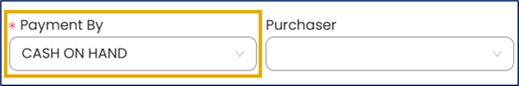 In the Payment By field, select the account used to pay for the purchase (e.g., Cash on Hand or Bank Account).