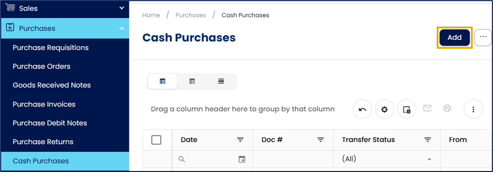 In the Navigation Pane, go to Purchases > Cash Purchases, then click Add.