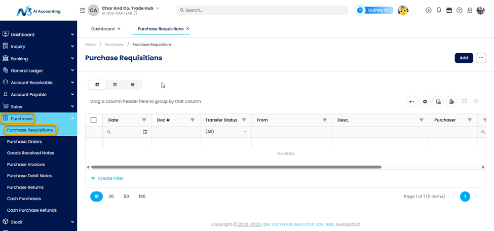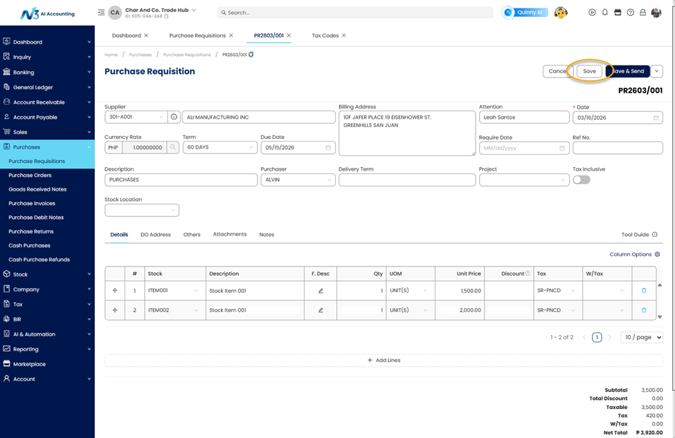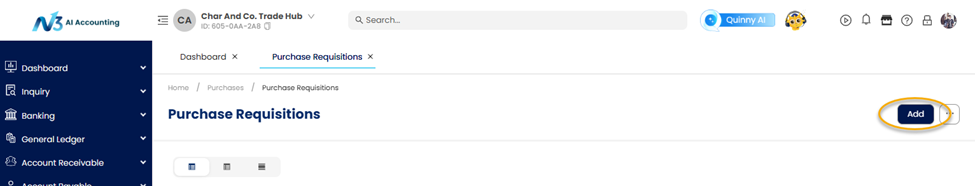 A Purchase Requisition (PR) is an internal document used by employees to formally request the purchase of goods or services before a Purchase Order is issued to a supplier. In N3 AI Accounting, creating a Purchase Requisition helps organizations maintain proper approval workflows, monitor purchasing needs, and ensure that procurement activities are properly documented before committing to suppliers.