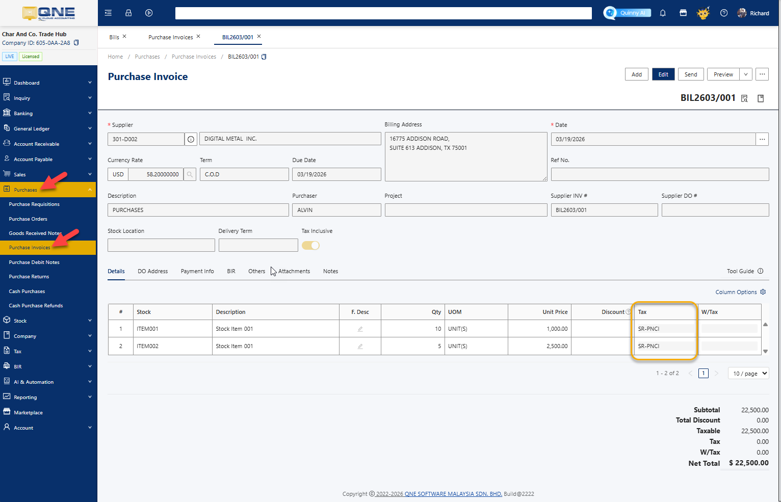 In the purchase transaction for imported goods, ensure that VAT codes with SR-PNCI are used. This is crucial for proper tax reporting and compliance.