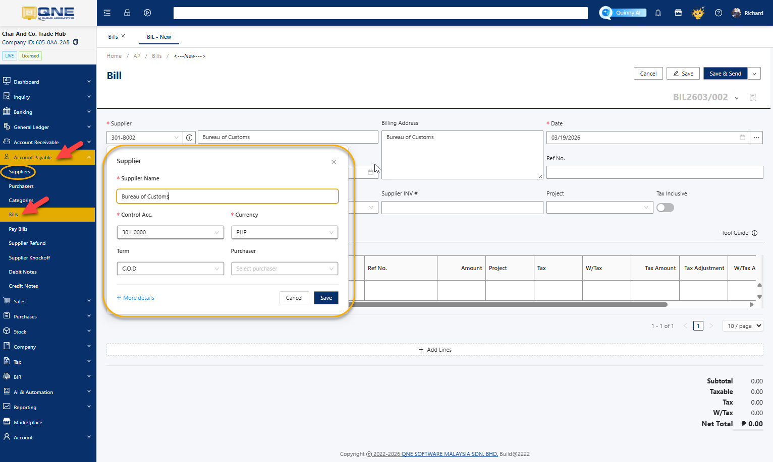 Go to Accounts Payable > Bills > Add in the N3 AI System.