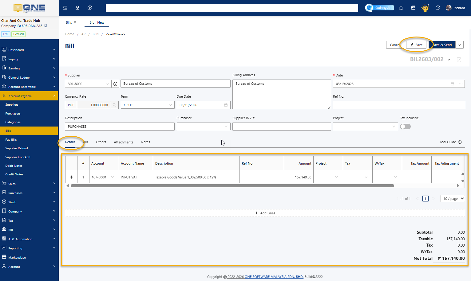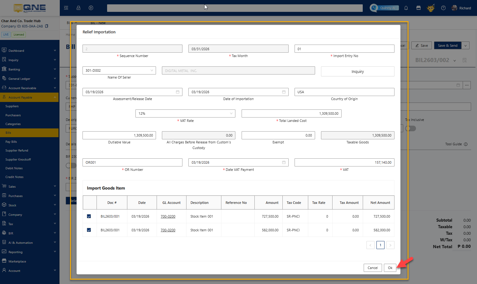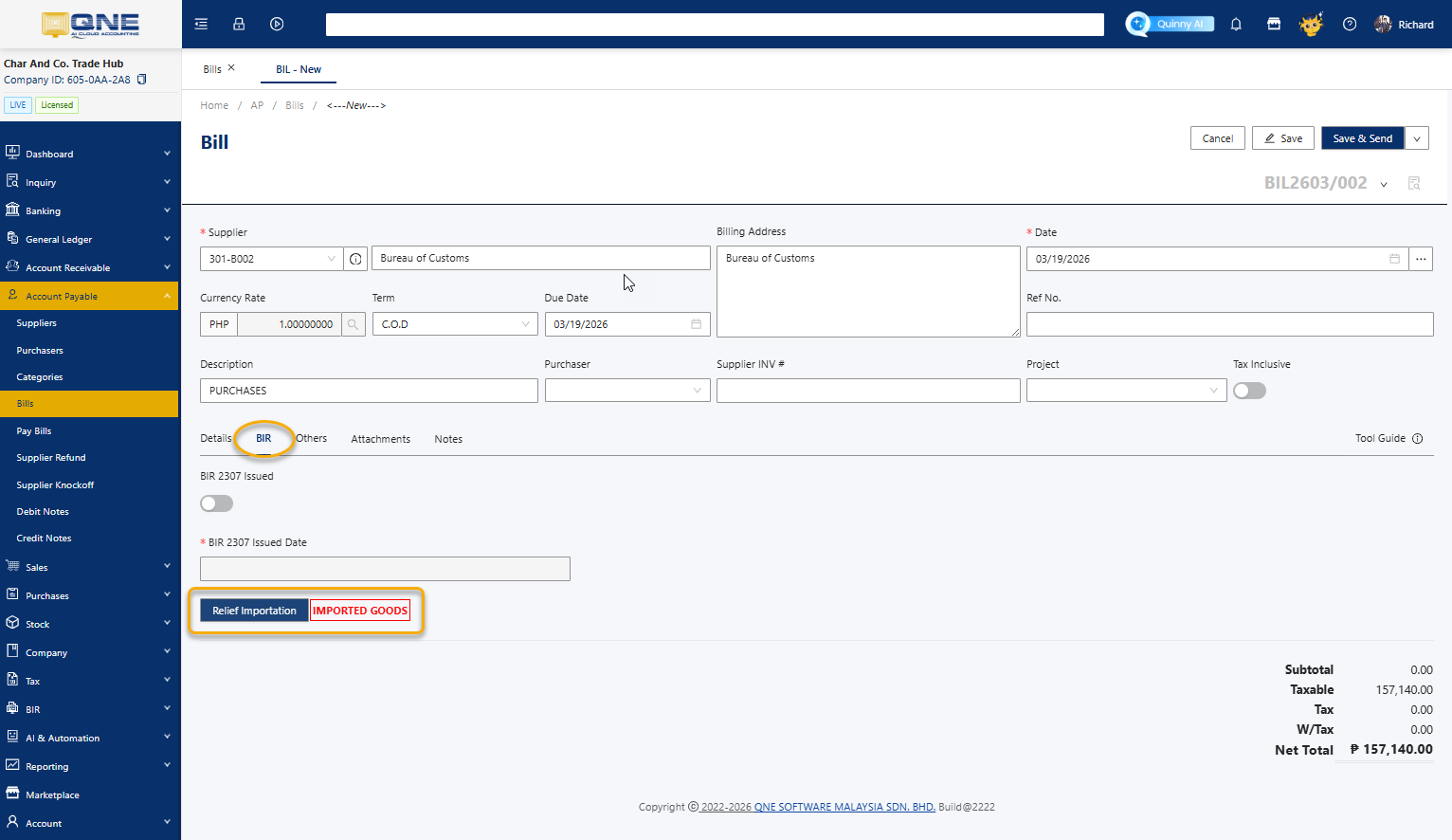 By following these steps, you can successfully record the Relief Importation transaction in the QNE System. This ensures accurate tax validation for imported goods and seamless generation of the Summary List of Importation (SLI) for BIR compliance. Keeping this process well-documented helps in maintaining transparency and accuracy in tax reporting for import transactions.