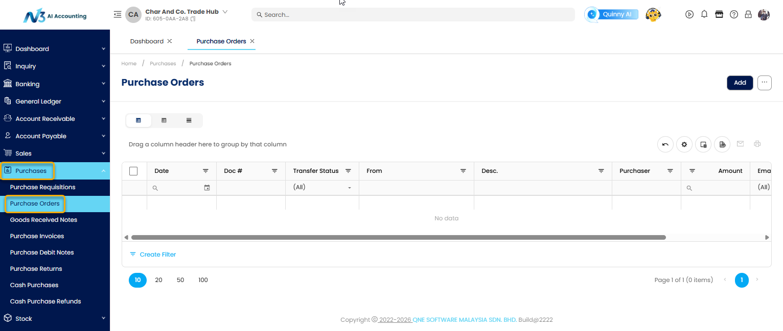 1. In the navigation pane, go to the Purchasing > Purchase Orders.
