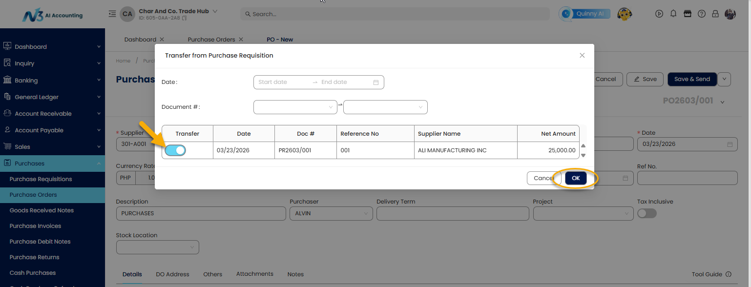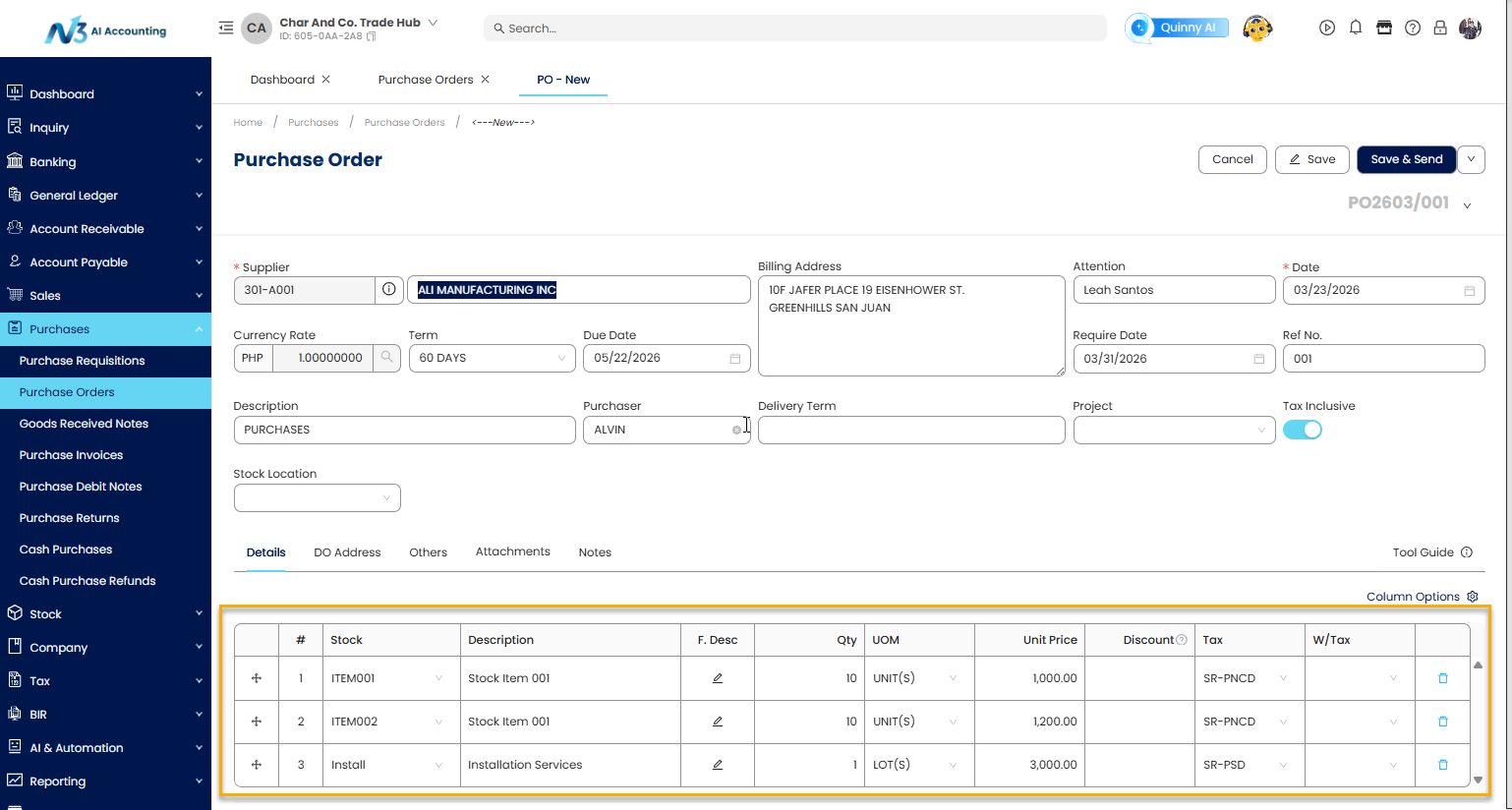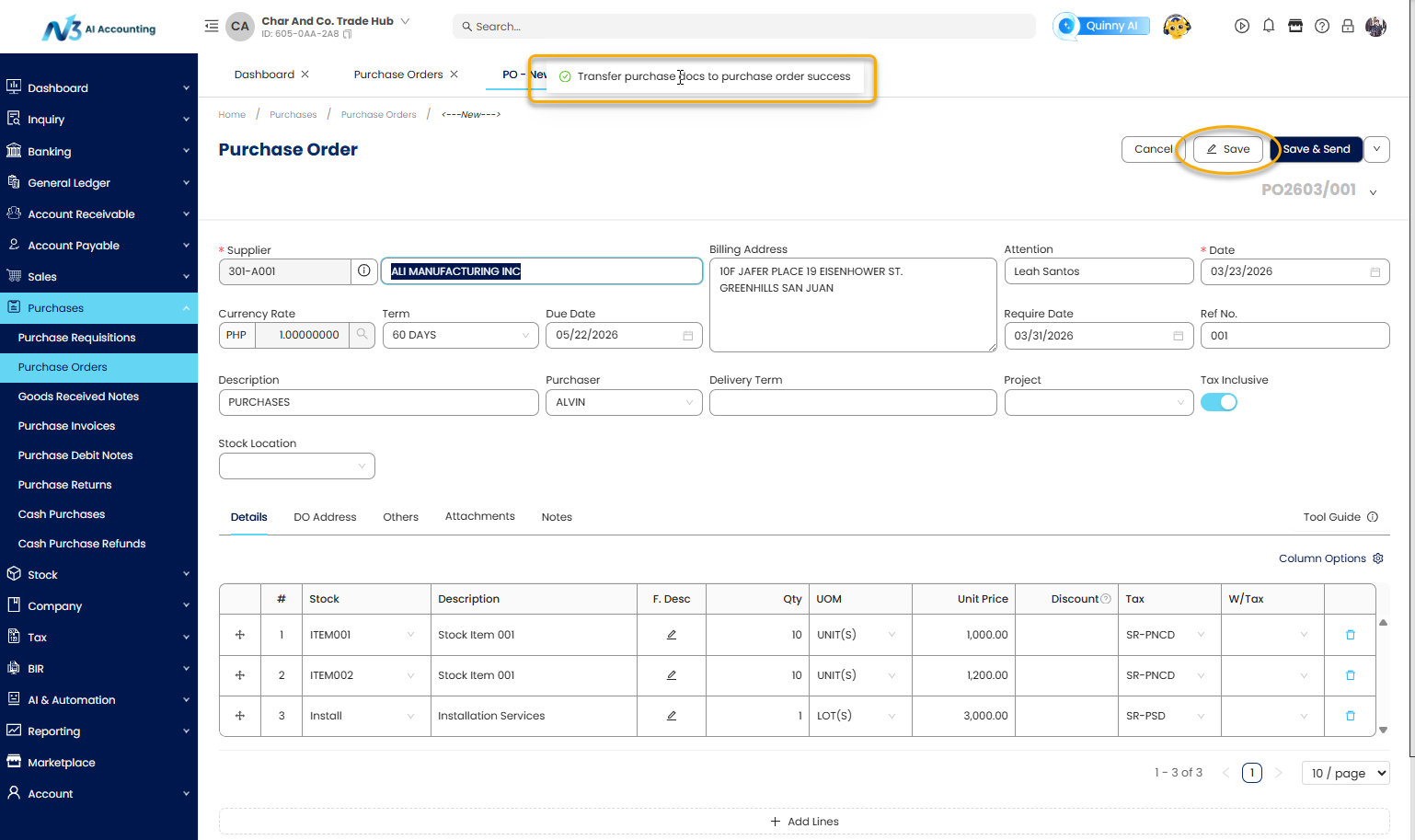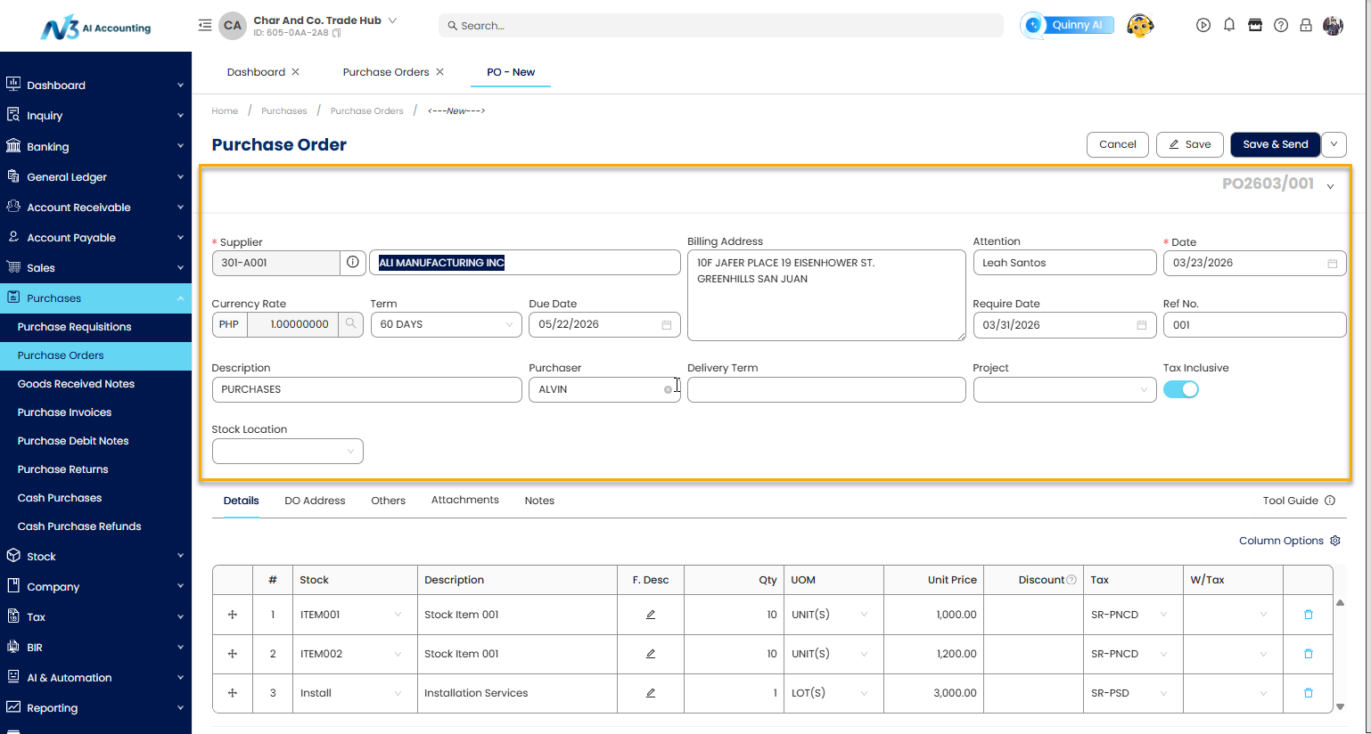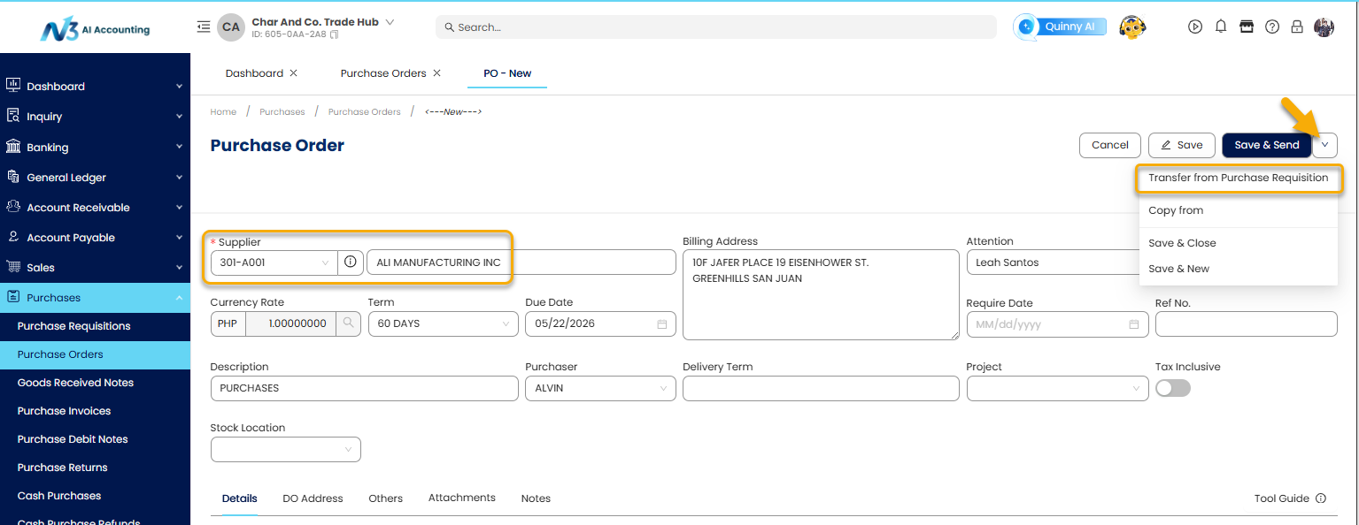 This guide walks you through the process of creating a Purchase Order within N3 AI Accounting, ensuring accuracy in supplier transactions and better inventory and financial management.